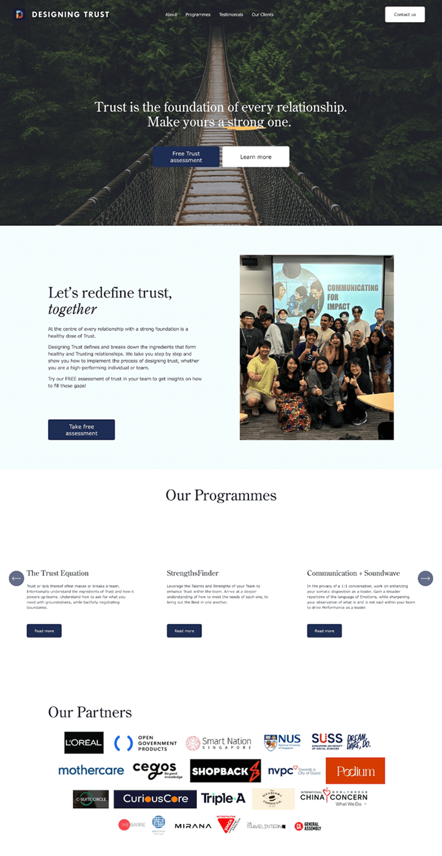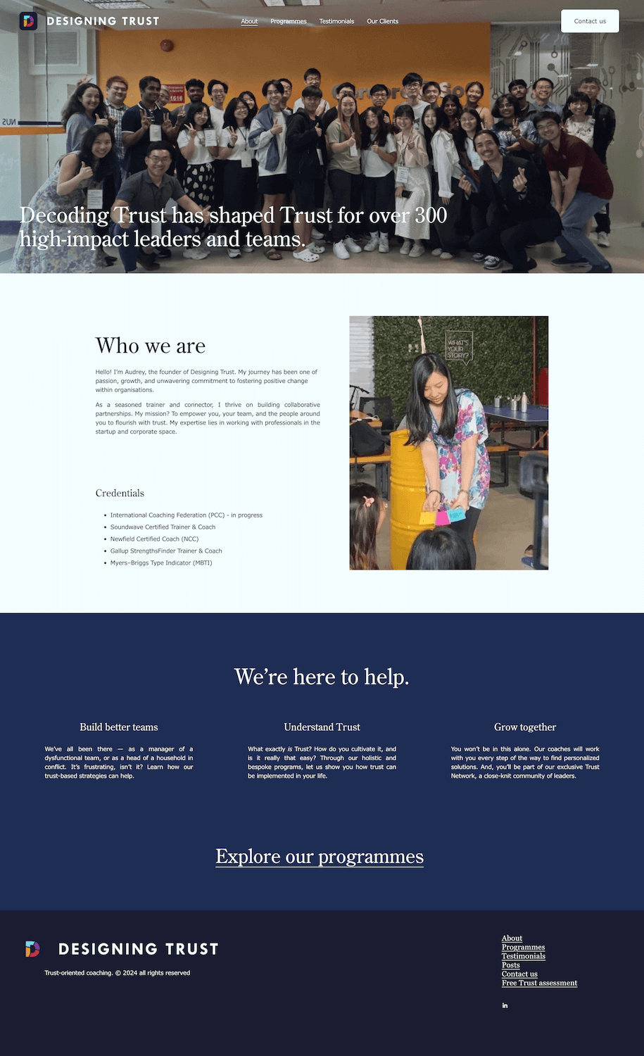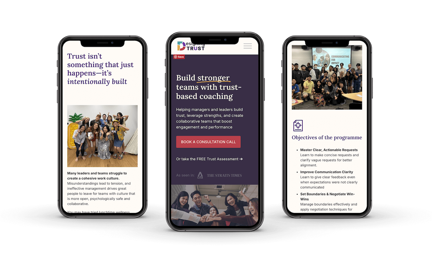 “Fiona’s extensive questions brought a user experience perspective to co-creating my website together. When a potential collaboration came up, having a website that explained who I am and what I do (including a video) helped build trust quickly and enabled smoother collaborations! I also received another inquiry from a large coaches group and I believe that the combination of my new website, LinkedIn profile, and a quick cost breakdown helped me secure a chat with someone from the company about a Leadership offsite in Korea!”