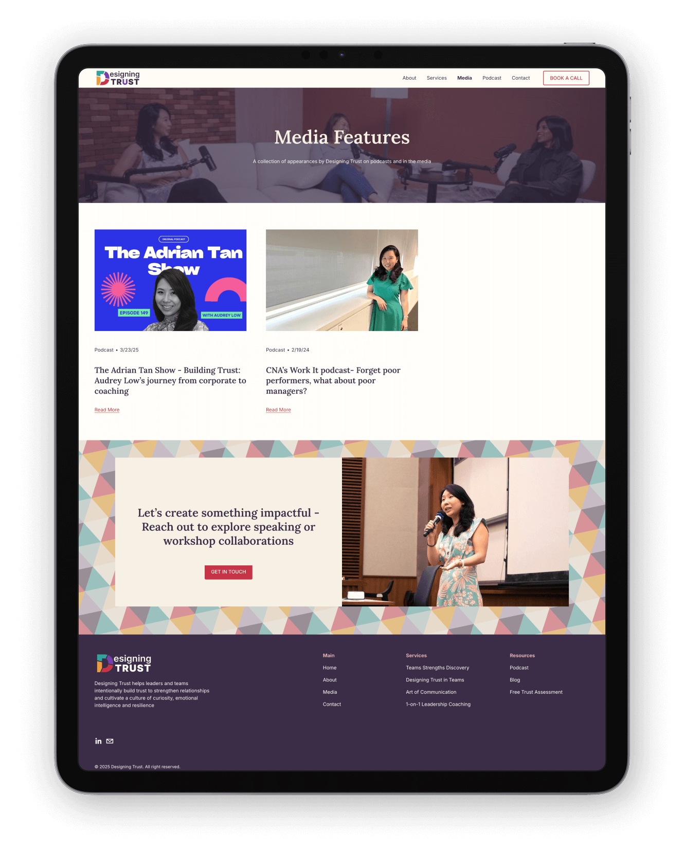 The new media features page provides a dedicated space to showcase Audrey’s podcast appearances and collaborations, building trust and positioning her as a thought leader in her niche.