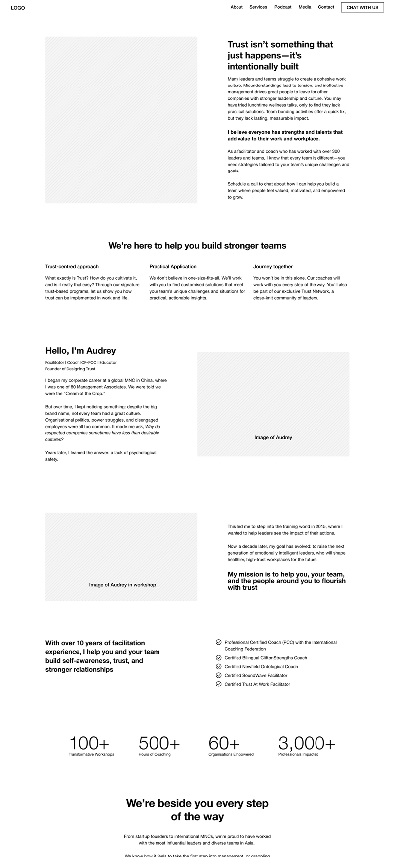 To add depth and cohesion across the site, I also incorporated layered, geometric shapes as section backgrounds. These clean, structured forms symbolise collaboration and connection, reinforcing Audrey’s message of trust and transformation while giving the website a distinctive, polished look.