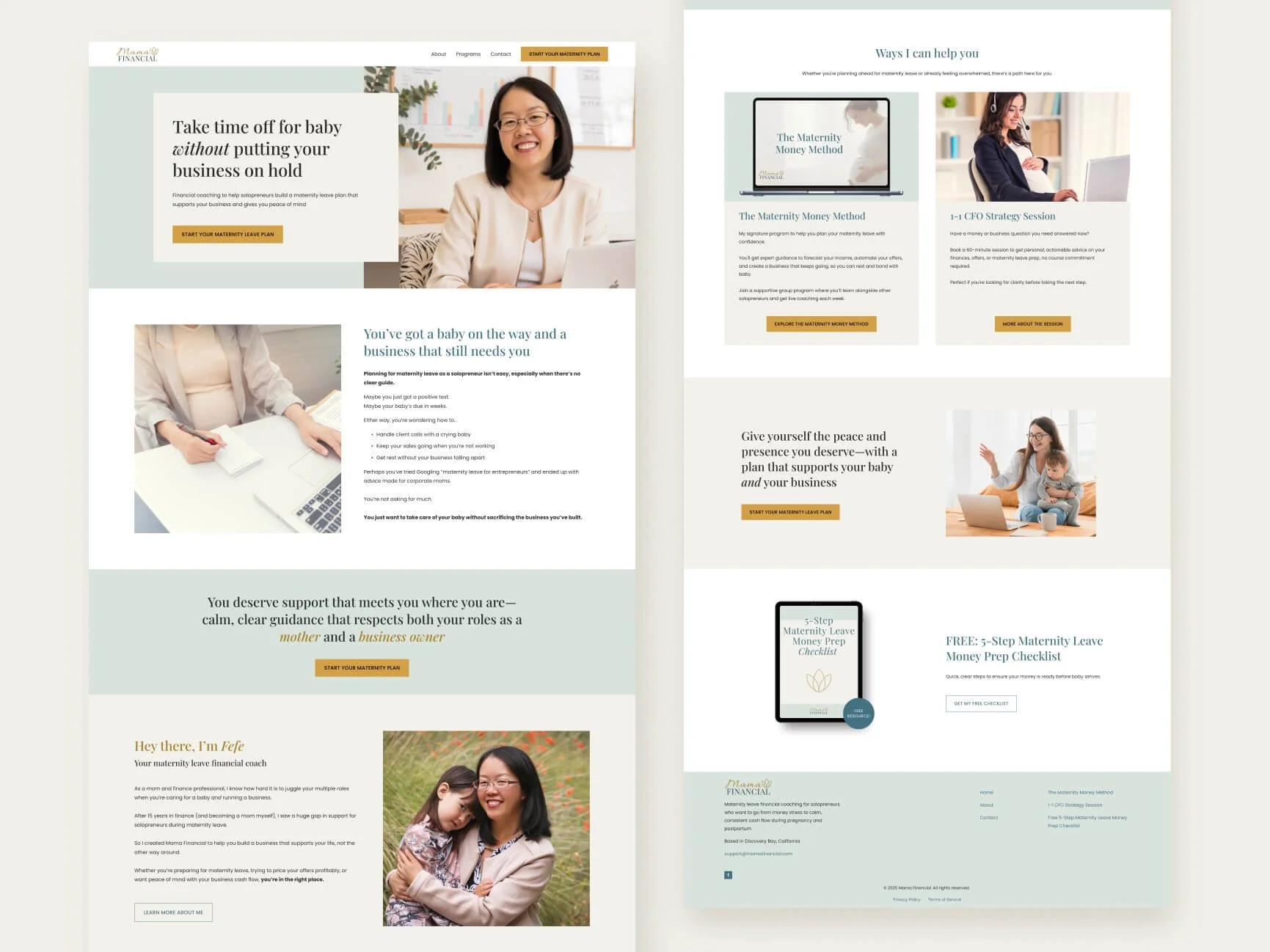 A new website and brand identity for a maternity leave financial coach, with cohesive visuals, clear service pages, and copy that builds trust and confidence to market her business.